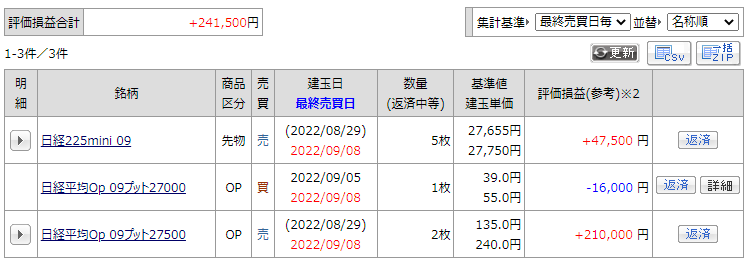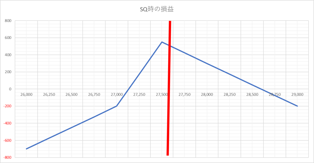 現在のポジションだと27,000円未満になった時に損失が拡大するので、安くなってる27,000円のプットを1枚購入。
