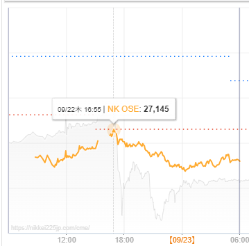 わかりにくいですが、日経平均先物のチャートだと、この時間に夕場の最高値を付けるも再度ダウントレンドに。