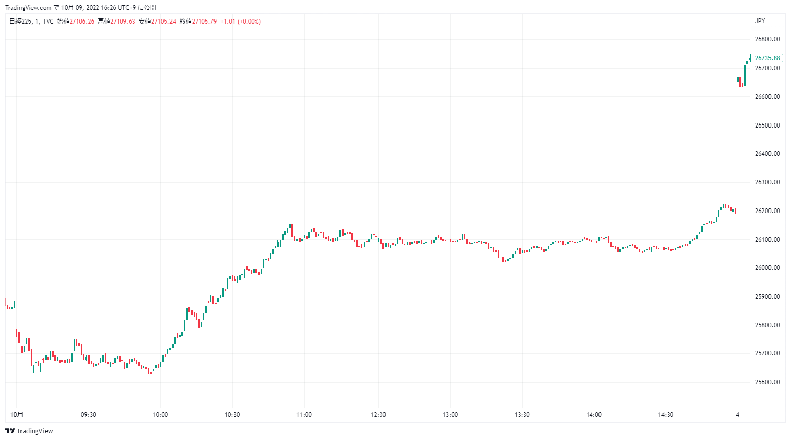 今日は約高値引け。朝は安値25650円前後だったものが、終値で26200円。トレンドは変わりつつあるか。取引はせず静観。