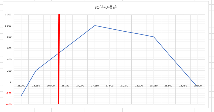 27250円プットのオプションを持ってた場合の損益曲線を見直し。最安値が9/28の25,938.36円。この時点ではSQまで2週間ちょっとあって、持ってたとしてもマイナスになるので維持できなかったので、損切りの行動自体は正解。もっと早いタイミングで損切りしなかった事が問題。