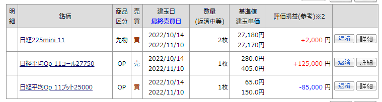 以下は25日の前場が始まってからのポジション。下落時のヘッジ用に入れた25000円プットの買いのマイナスが積み上がっている。