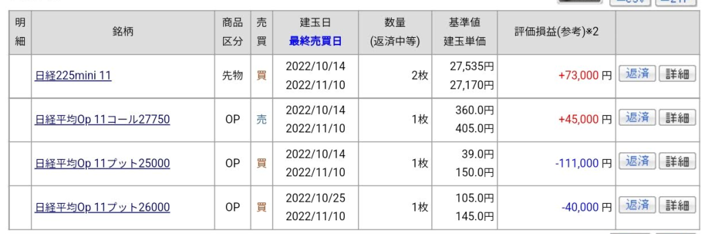 SQまで2週間半。この間に大きく下がることを期待?して下のプットのポジションを追加。先週から継続して入れておいた注文が約定。