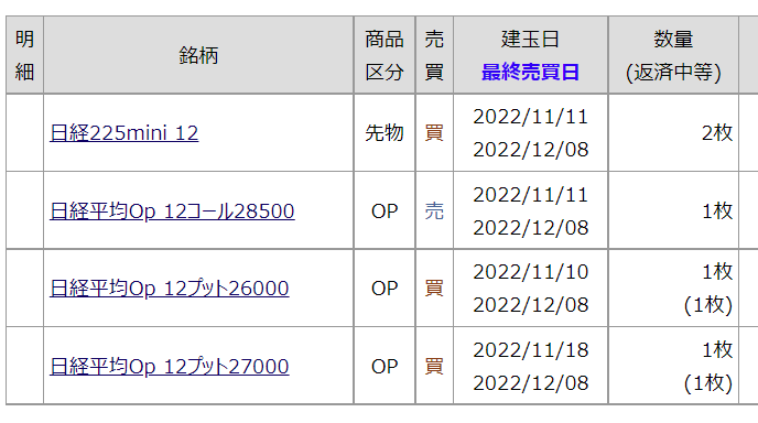 ポジションは残り3週間でどちらかに動く可能性が高いと思っていてプット側の将来的のポジションを追加。コール27000円1枚買い。120円