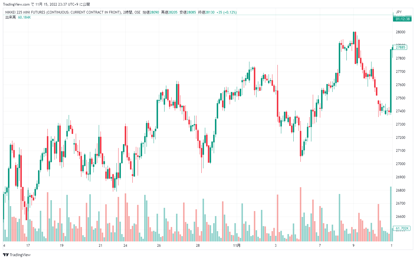 あげてるチャートは10月14日のSQから11月11日のSQまでの2時間足。こうしてみると上昇トレンドがよくわかります。