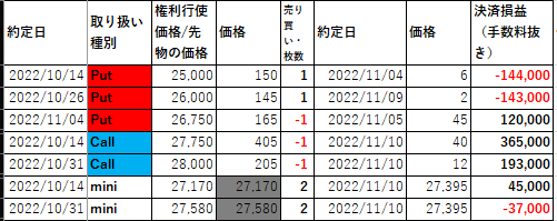 利益はコール側で10月14日(日経平均225終値で+853.34円)、10月31日(同+482.26円)に大きく上がったときに建てたコール側のポジションで得た。