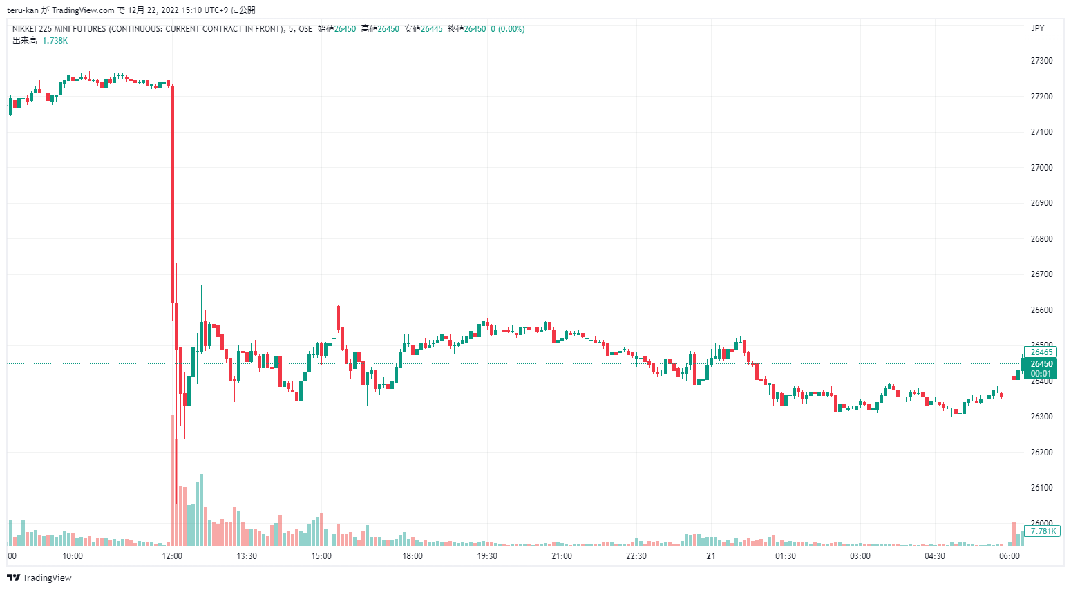日銀の発表を日経新聞で見たのが発表あってから20分後くらいで、そのタイミングで日経平均先物のは-900円以上。ここで日経平均オプションのポジションをクローズした。